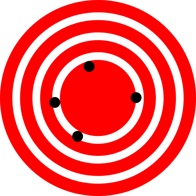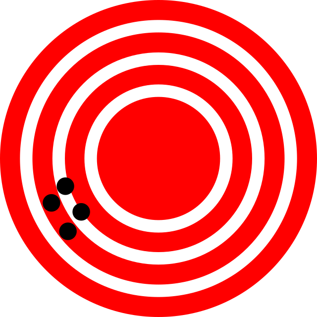 日常会話では同じ意味で使われがちですが、工学や統計の世界では明確に区別されます。ダーツの的をイメージすると分かりやすいです。